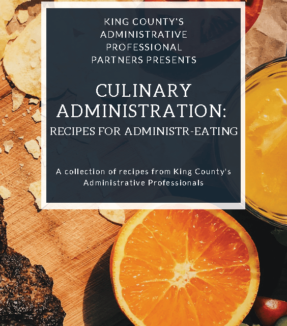 King County’s Administrative Professional Partners is proud to present Culinary Administration: Recipes for Administr-eating, a collection of recipes submitted by Administrative Professionals throughout King County. Thank you to everyone who contributed to this effort. To download the cookbook, click here – and enjoy!