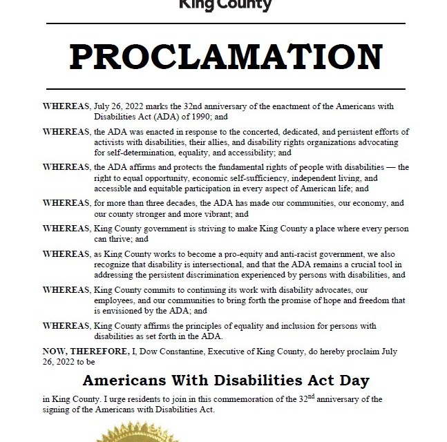 By Dow Constantine, King County Executive On the 32nd anniversary of the signing of the Americans with Disabilities Act (ADA), with our work to become a pro-equity and anti-racist government, we also recognize that disability is intersectional, and that the ADA remains a crucial tool in addressing the persistent discrimination experienced by persons with disabilities.