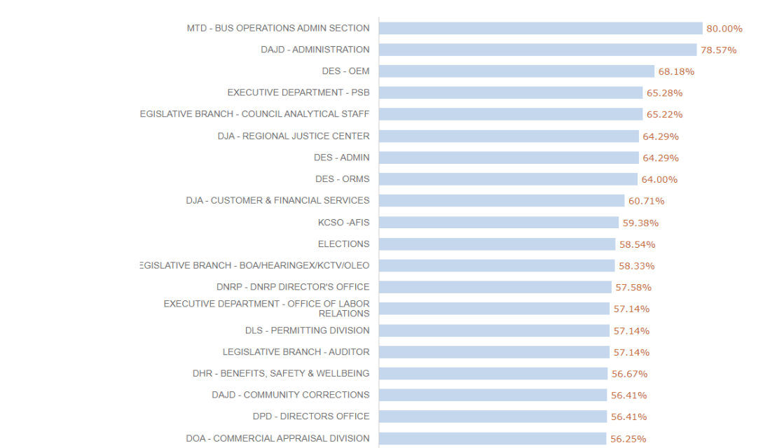 As King County Executive Dow Constantine said in his latest employee message, the results of the 2019 Employee Survey are now available. The results for the County overall and your department or division can be viewed here (Sharepoint). Work group results will be available soon. Overall, we had a 70% response rate, up 11 points from our first annual survey in 2015 and our highest participation rate ever. Employee engagement continued its steady increase, with our engagement index climbing two points from 2017 – a significant jump for an organization our size – and up… Read More